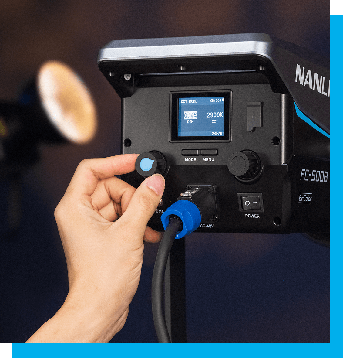 The Nanlite FC 500B is a true bi-color spotlight with tunable CCT from 2700K (warm tungsten) to 6500K (cool daylight), delivering accurate colors (CRI 96+, TLCI 98) without RGB capabilities. Bowens S-mount supports a wide range of modifiers like softboxes, reflectors, and projections for flexible cinema lighting rental. Enjoy 12 built-in effects (CCT loop, flash, storm, fire, etc.) via intuitive onboard controls or wireless options – perfect for creative shoots with lights on rent from GRI.